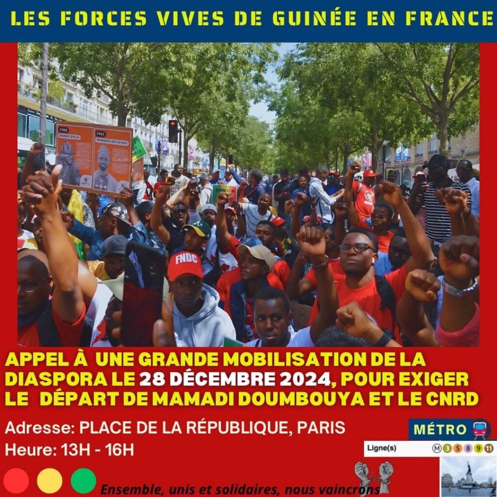 Tous les Guinéens et toutes les Guinéennes, sans exception, ainsi que tous les citoyens pro-démocratie sont solennellement conviés à prendre part à la manifestation de ce samedi 28 décembre 2024, dès 13h, à la PLACE DE LA RÉPUBLIQUE, à Paris.