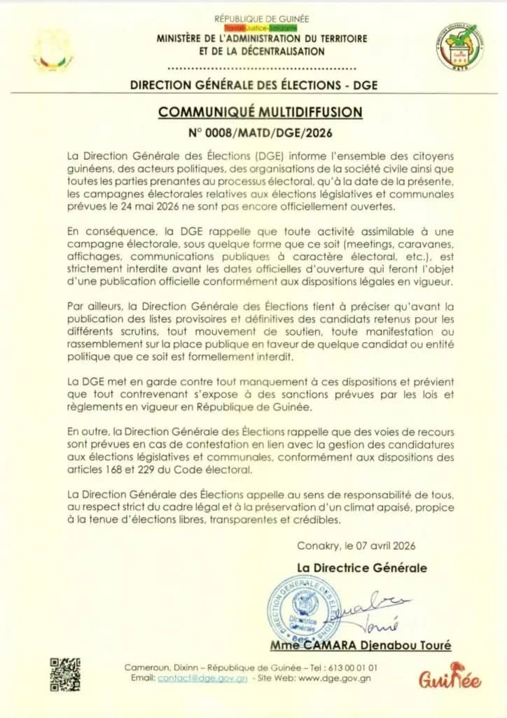 Elle rappelle, avec fermeté, que l’ouverture officielle de la campagne pour les élections communales et législatives est fixée au 24 mai prochain, appelant chacun au respect du calendrier afin de préserver la transparence et la sérénité du processus électoral.