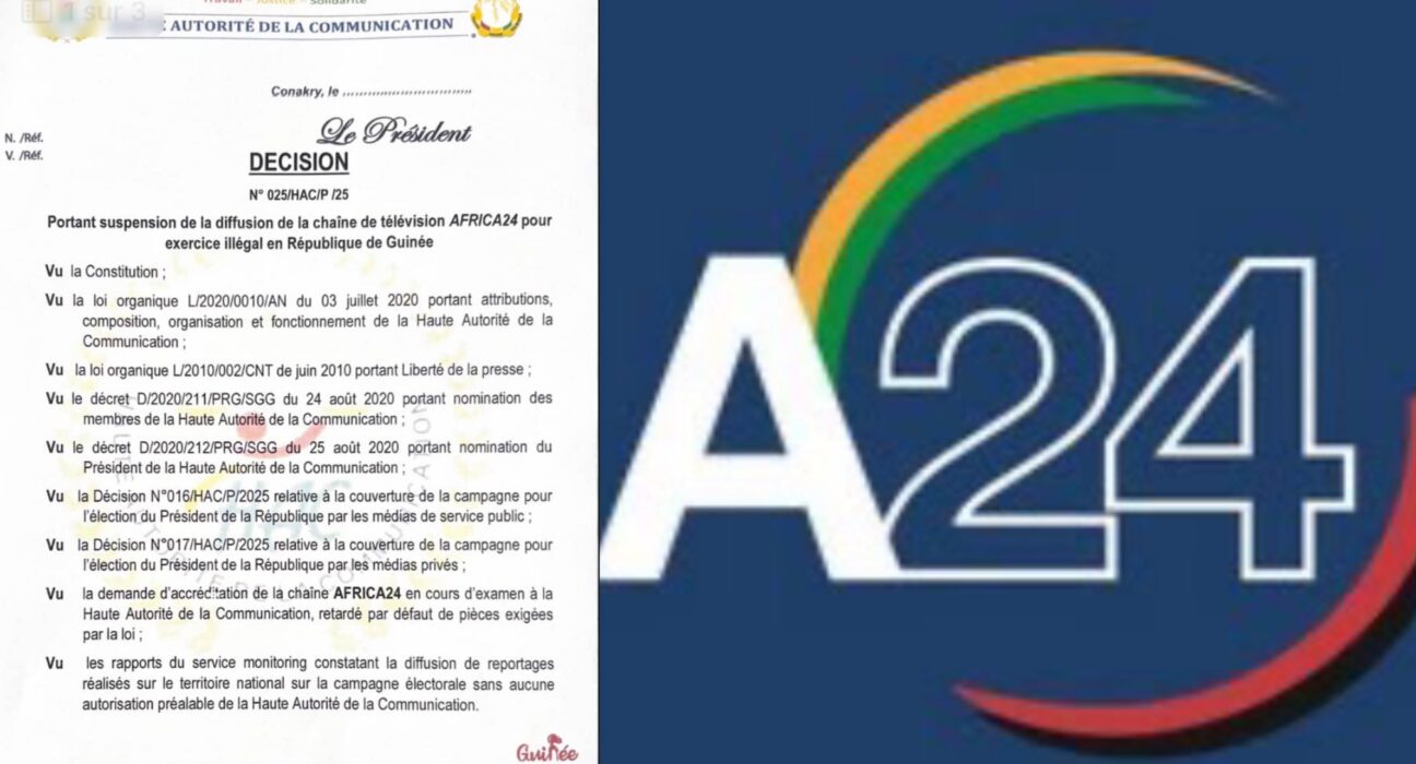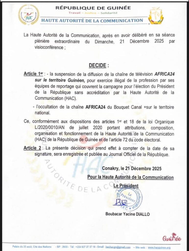 La Haute Autorité de la Communication (HAC) a annoncé, dans la soirée de ce dimanche, l’exclusion de la chaîne Africa24 du bouquet Canal+ en Guinée. La mesure, qui inclut une suspension immédiate, est motivée par des activités considérées comme non conformes à la réglementation en vigueur sur le territoire guinéen.
