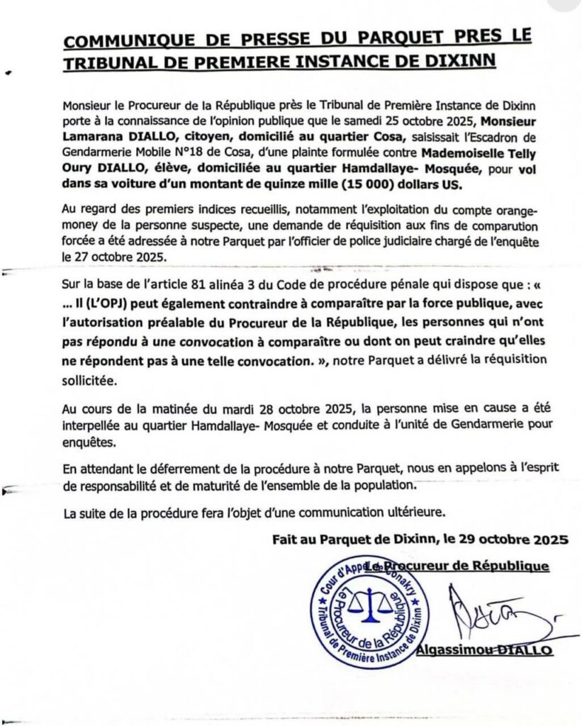 Le document signé par le Procureur Algassimou Diallo précise que l’affaire a été déclenchée le samedi 25 octobre 2025, à la suite d’une plainte déposée par un citoyen.
