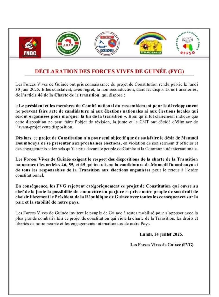 Dans une déclaration rendue publique ce lundi 14 juillet 2025, les Forces Vives de Guinée ont fermement rejeté le projet de Constitution. Selon elles, ce texte ouvrirait la voie au Général Mamadi Doumbouya pour se parjurer et priver le peuple souverain de son droit fondamental à choisir librement le président de la République.
