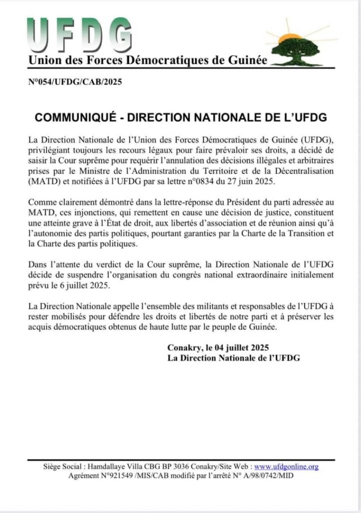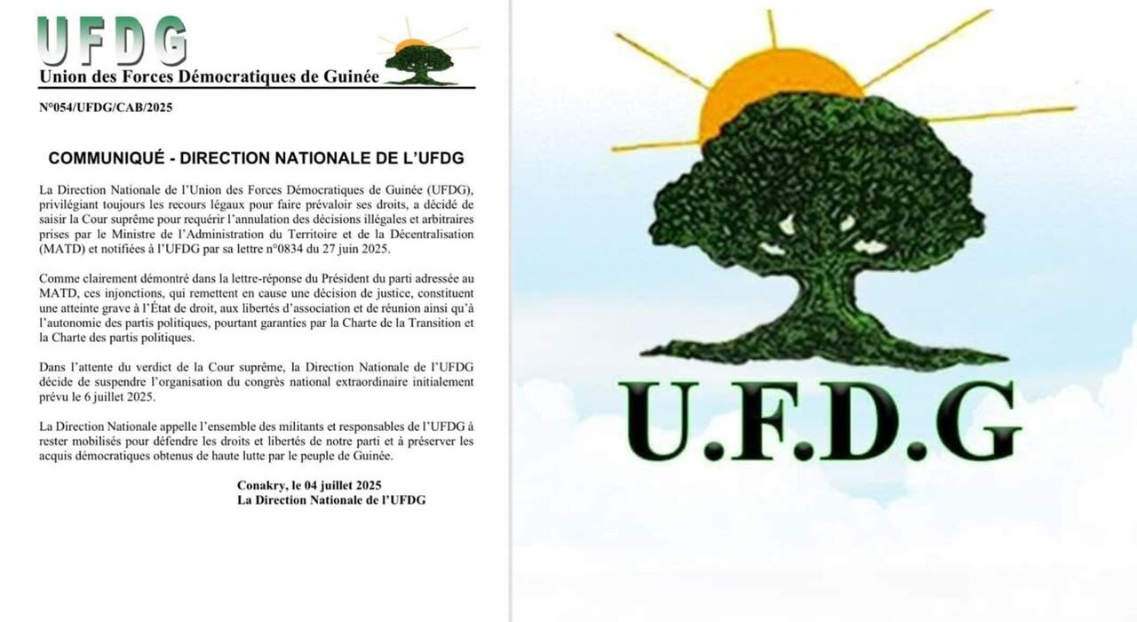 L’Union des Forces Démocratiques de Guinée (UFDG) annonce avoir saisi la Cour suprême pour contester des décisions du ministère de l’Administration du Territoire, qu’elle juge contraires à une décision de justice. En attendant l’issue de cette procédure, le congrès national extraordinaire initialement prévu le 6 juillet 2025 est suspendu. La Direction du parti appelle ses militants à rester mobilisés pour la défense des droits du parti et des acquis démocratiques.