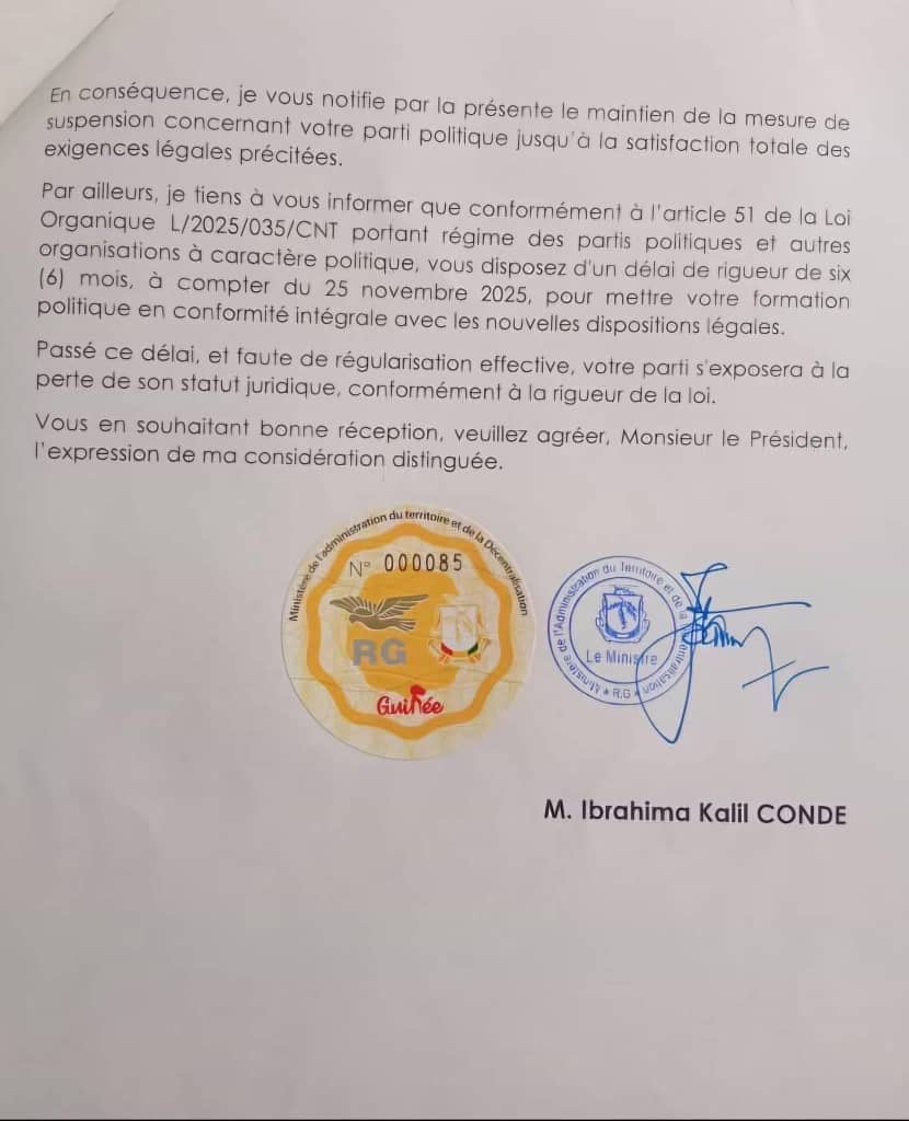 Les autorités guinéennes, par l’intermédiaire du ministère de l’Administration du Territoire et de la Décentralisation, ont adressé un avertissement formel à la formation politique dirigée par Cellou Dalein Diallo. Dans un communiqué rendu public et signé par le général à la retraite Ibrahim Kalil Condé, le ministère indique que le parti dispose d’un délai de six mois pour se mettre en règle avec les dispositions légales en vigueur.