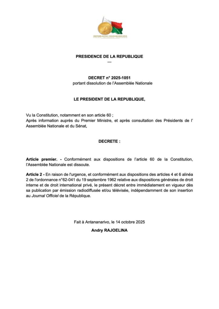 Ce mardi 14 octobre 2025, la présidence de la République de Madagascar a publié sur sa page Facebook un décret dissolvant l’Assemblée nationale. Cette annonce intervient alors que les députés se réunissaient pour lancer une procédure de destitution contre le président Andry Rajoelina, accusé d’abandon de poste.