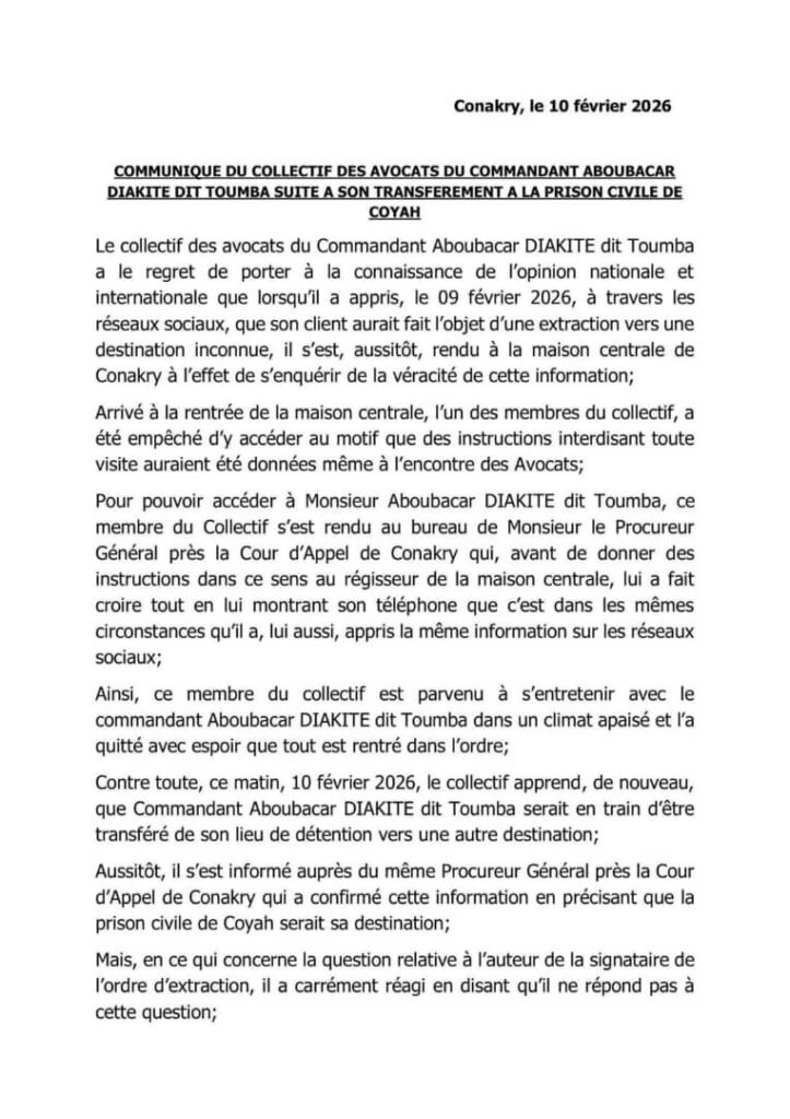 Dans un communiqué, le collectif d’avocats de Toumba Diakité affirme avoir découvert le 9 février 2026, par le biais des réseaux sociaux, le transfert de leur client vers une destination tenue secrète.